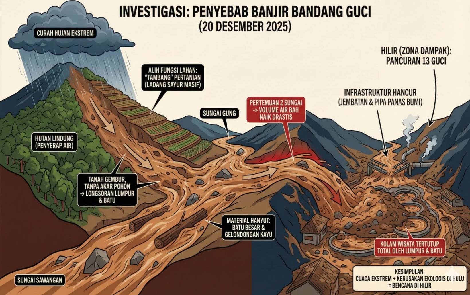 Dia menjelaskan, bencana bandang di kawasan wisata guci dikarenakan kombinasi faktor alamiah seperti struktur geologi yang labil, iklim basah dengan curah hujan ekstrem yang membuat tanah tidak stabil.