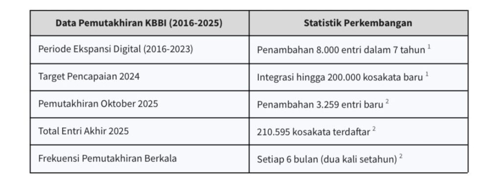 Hingga pemutakhiran edisi Oktober 2025, KBBI telah mencatat total 210.595 entri setelah penambahan terbaru sebanyak 3.259 kata. Perkembangan leksikografi kontemporer ini menandai pergeseran paradigma yang signifikan dari pendekatan preskriptif murni menuju pendekatan preskriptif-deskriptif yang saling melengkapi.