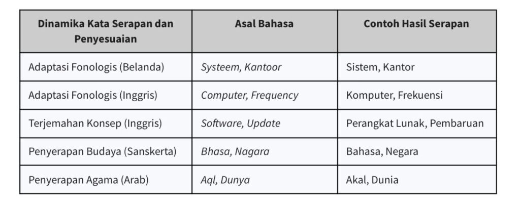 Di sisi lain, penyerapan dari bahasa asing (Inggris, Belanda, Arab, Portugis, Sanskerta) terus berlangsung melalui berbagai mekanisme seperti adopsi, adaptasi fonologis, dan terjemahankonsep.