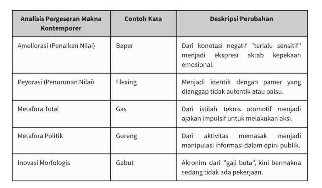 Studi linguistik menunjukkan bahwa percepatan komunikasi digital telah mendorong terjadinya pergeseran semantik yang masif melalui lima mekanisme utama: pelebaran makna (broadening), penyempitan makna (narrowing), ameliorasi, peyorasi, dan perubahan metaforis total.