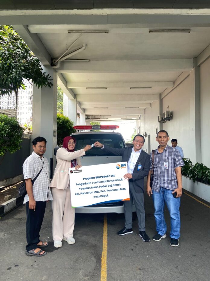 RBN, DEPOK – Bank Rakyat Indonesia (BRI) Kantor Cabang (KC) Depok menyalurkan bantuan program Tanggung Jawab Sosial Lingkungan (TJSL) berupa Ambulance ke Yayasan Insan Peduli Sejahterah yang berlokasi di Kelurahan/Kecamatan Pancoranmas, Kota Depok.