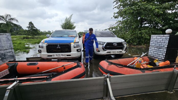 Namun demikian, akses menuju lokasi GISTET Kembangan terdampak banjir dengan ketinggian genangan sekitar ±50–70 sentimeter, sehingga kendaraan operasional tidak dapat melintas. Untuk memastikan kegiatan pengawasan tetap berjalan, mobilisasi personel dilakukan menggunakan perahu karet dengan tetap mengedepankan aspek keselamatan kerja.